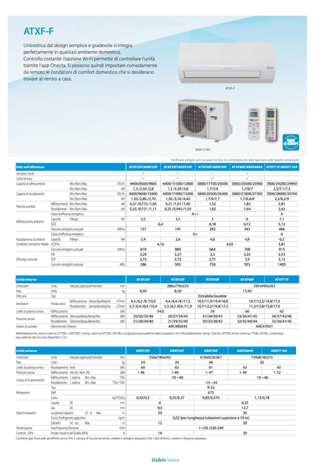 Raffreddamento: temp. interna 27°CBS, 19,0°CBU / temp. esterna 35°CBS, 24°CBU; lunghezza equivalente delle tubazioni: 5m | Riscaldamento: temp. interna 20°CBS; temp. esterna 7°CBS, 6°CBU; lunghezza