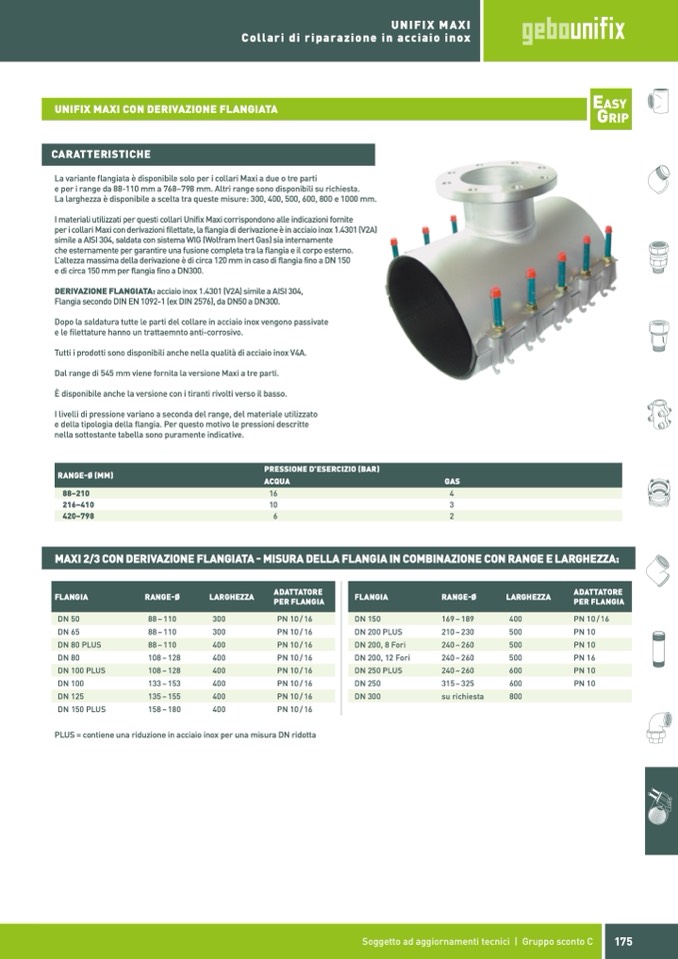 per i collari Maxi con derivazioni filettate, la flangia di derivazione è in acciaio inox 1.4301 (V2A)