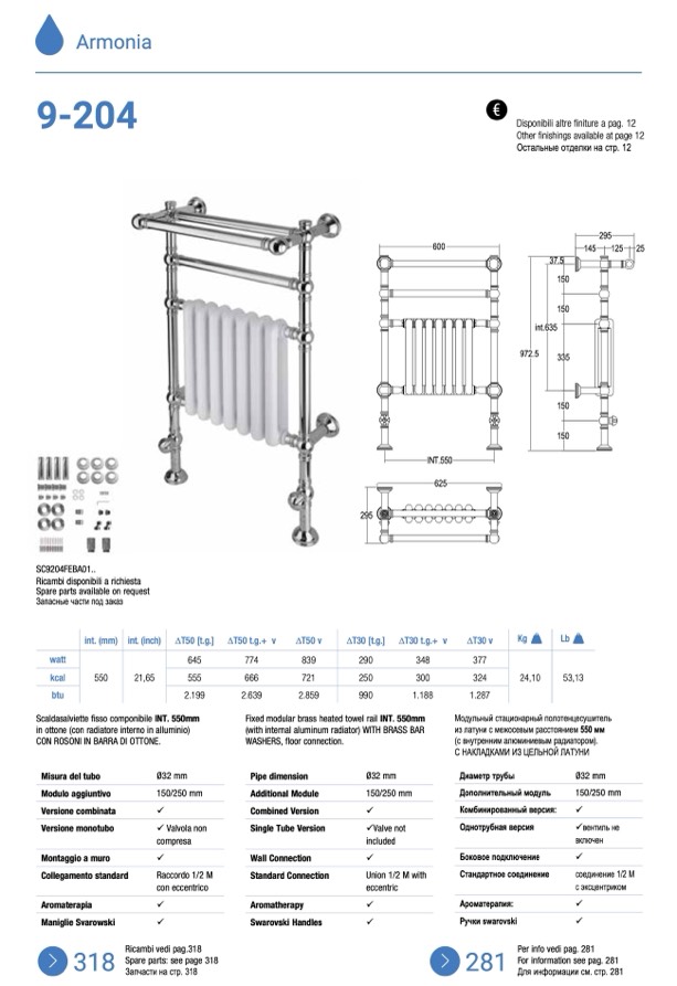 Fixed modular brass heated towel rail INT. 550mm