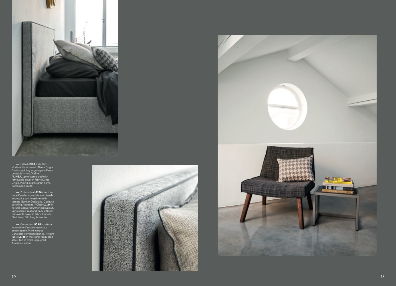 Grigia. Piping in gros grain Ferro.