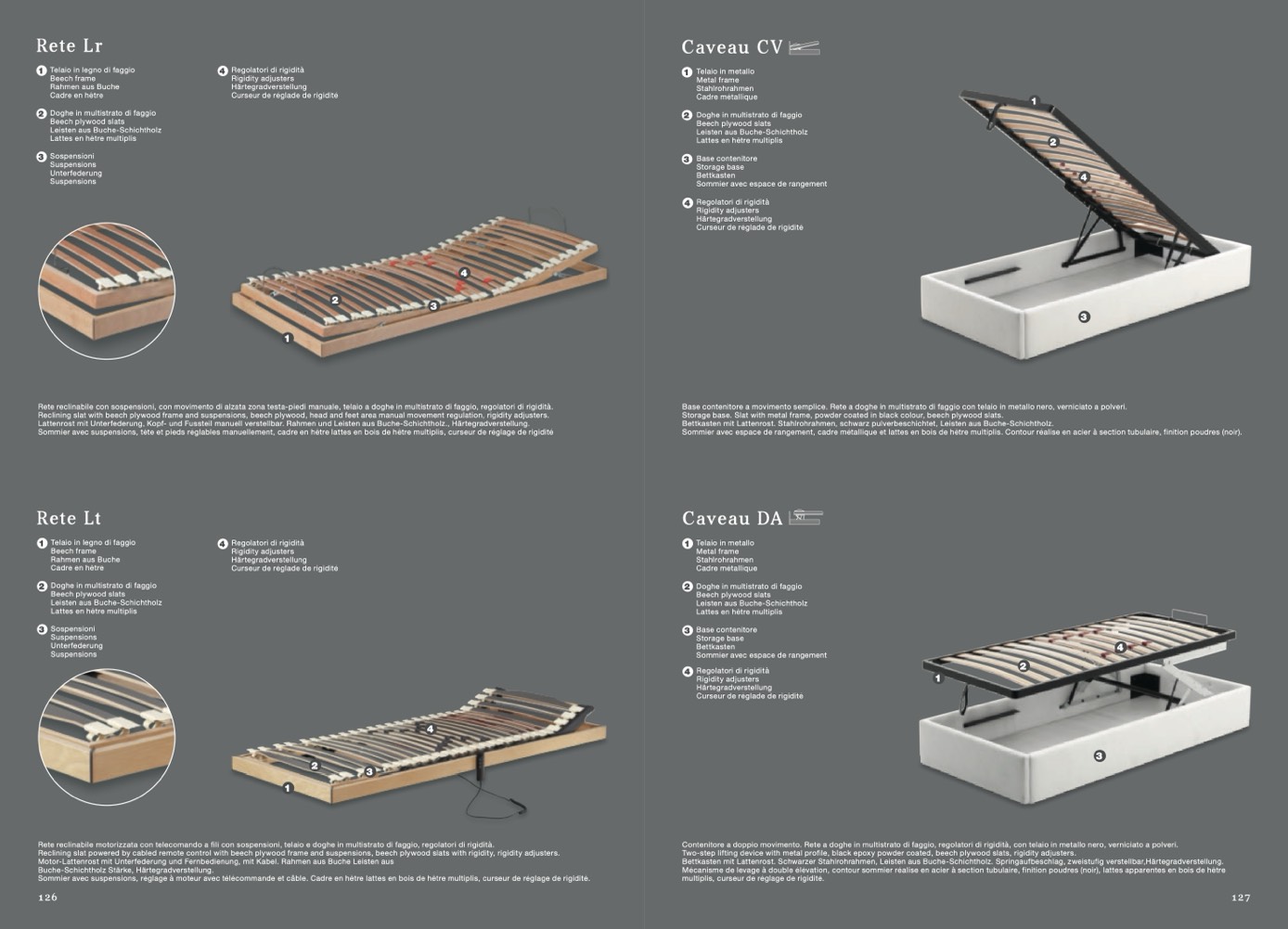 Contenitore a doppio movimento. Rete a doghe in multistrato di faggio, regolatori di rigidità, con telaio in metallo nero, verniciato a polveri.
