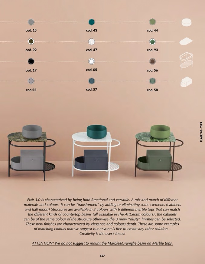 the different kinds of countertop basins (all available in The.ArtCeram colours); the cabinets