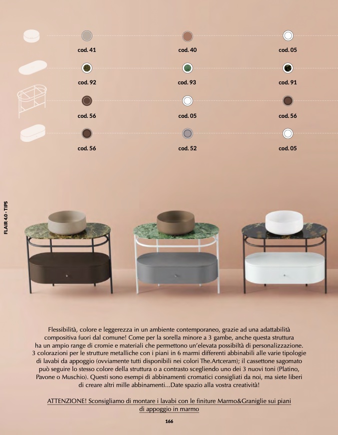 3 colorazioni per le strutture metalliche con i piani in 6 marmi differenti abbinabili alle varie tipologie