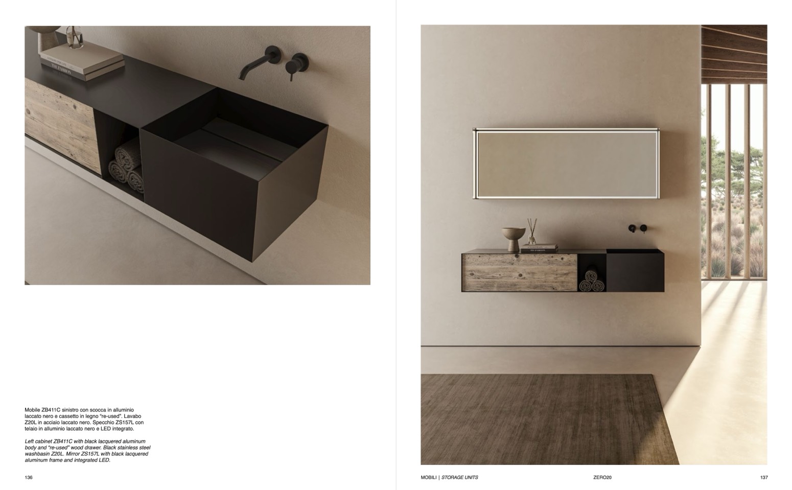 laccato nero e cassetto in legno “re-used”. Lavabo