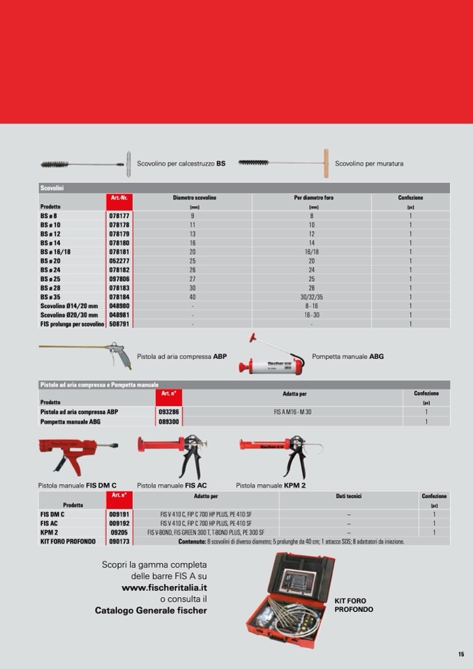090173 Contenuto: 8 scovolini di diverso diametro; 5 prolunghe da 40 cm; 1 attacco SDS; 8 adattatori da iniezione.