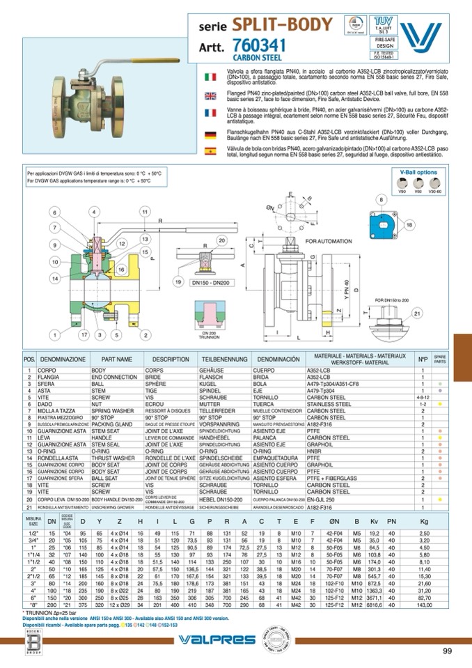 (DN>100), a passaggio totale, scartamento secondo norma EN 558 basic series 27, Fire Safe,