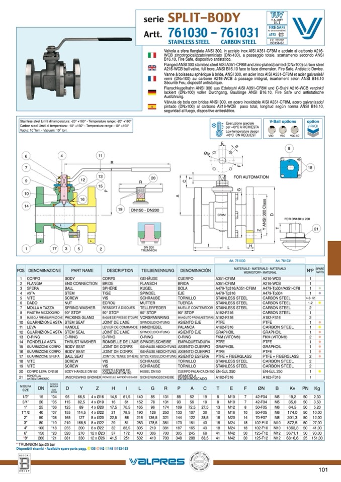 Valvola a sfera flangiata ANSI 300, in acciaio inox AISI A351-CF8M e acciaio al carbonio A216-