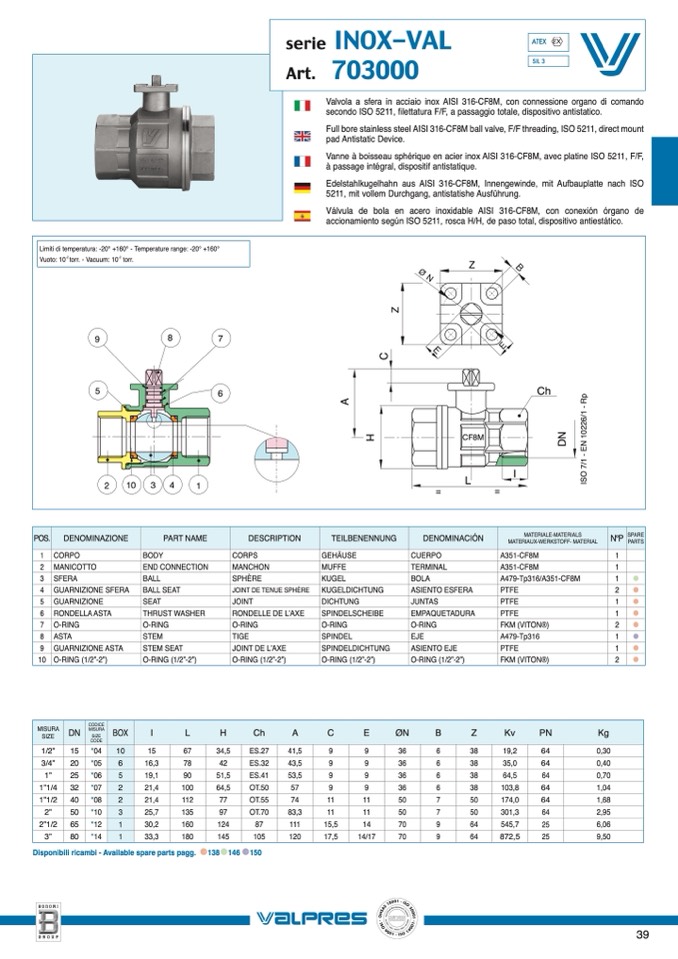 Limiti di temperatura: -20° +160° - Temperature range: -20° +160°