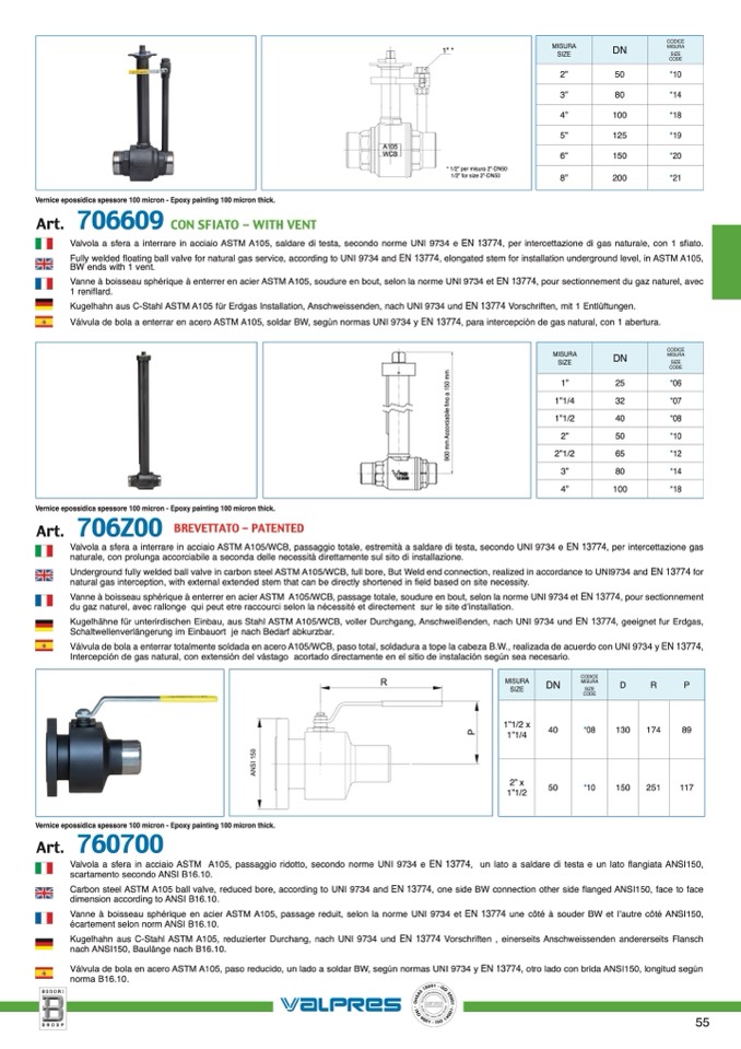 Válvula de bola a enterrar totalmente soldada en acero A105/WCB, paso total, soldadura a tope la cabeza B.W., realizada de acuerdo con UNI 9734 y EN 13774,