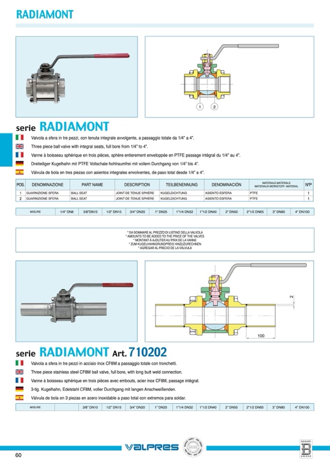 Valvola a sfera in tre pezzi, con tenuta integrale avvolgente, a passaggio totale da 1/4” a 4”.