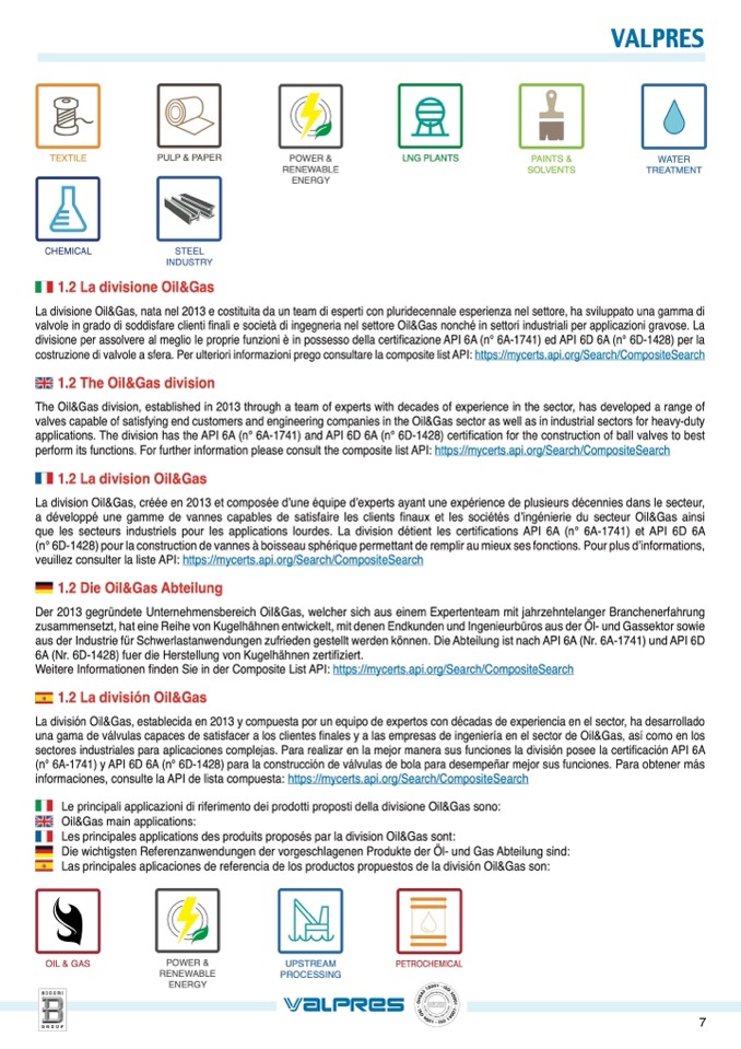 applications. The division has the API 6A (n° 6A-1741) and API 6D 6A (n° 6D-1428) certification for the construction of ball valves to best
