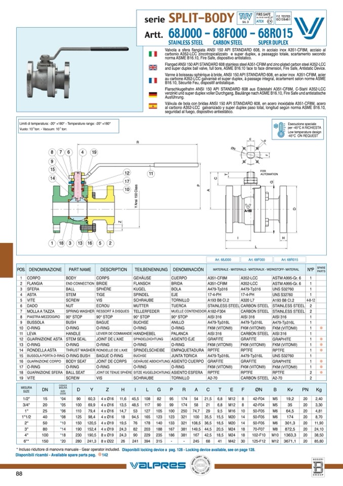 and super duplex ball valve, full bore, ASME B16.10 face to face dimension, Fire Safe, Antistatic Device.