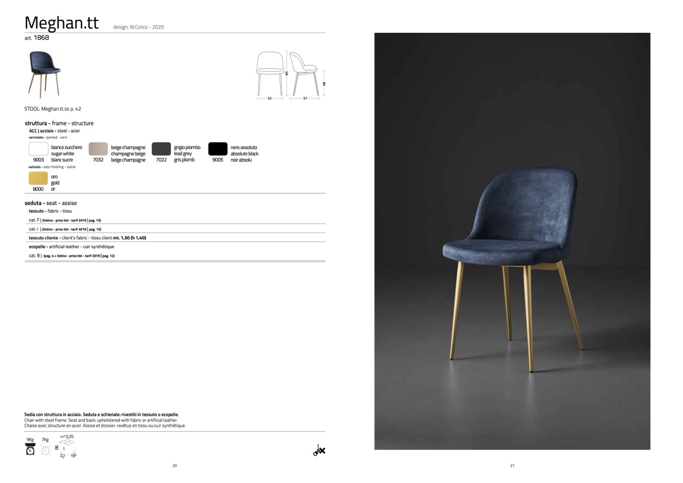 Sedia con struttura in acciaio. Seduta e schienale: rivestiti in tessuto o ecopelle.