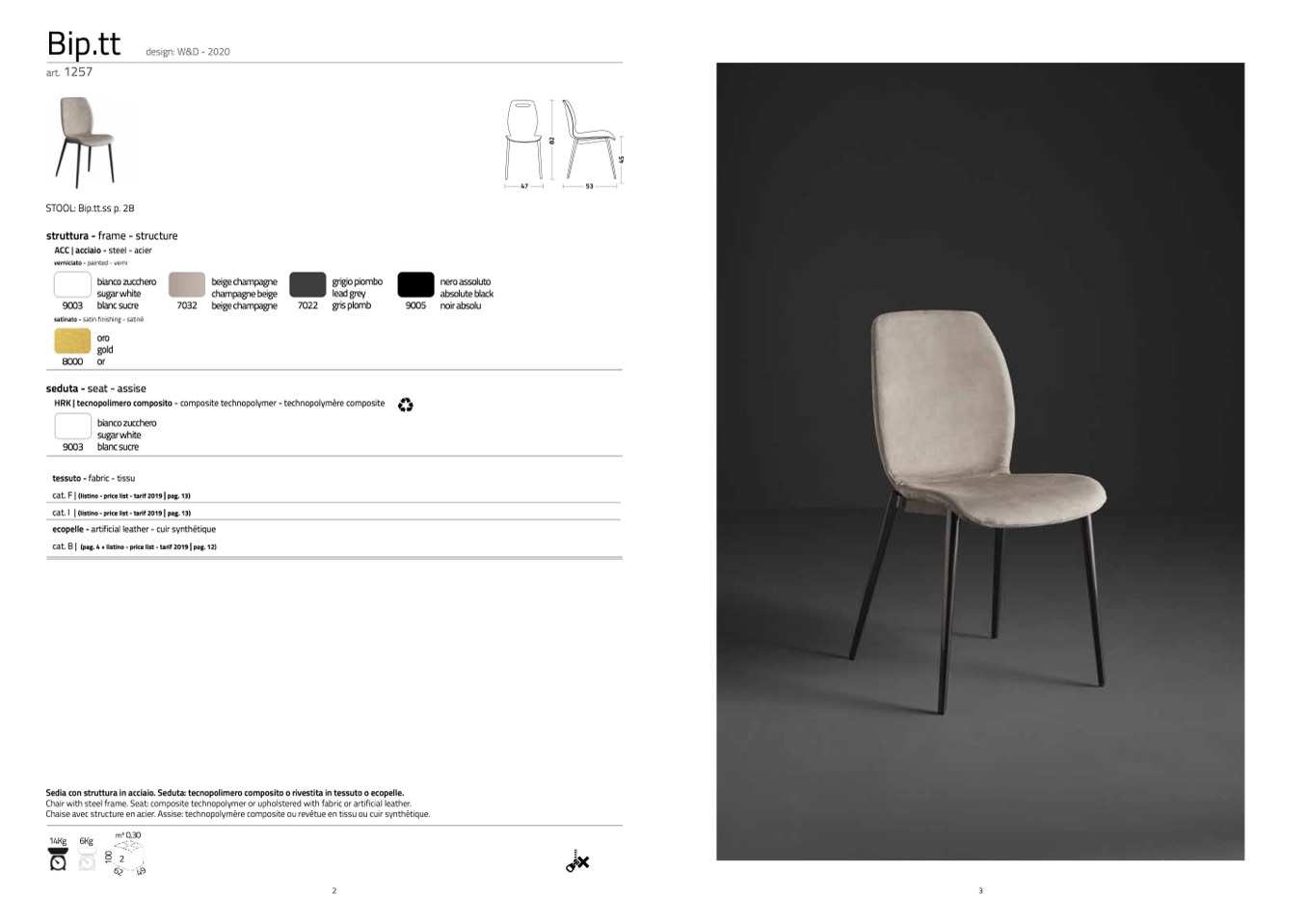 Chaise avec structure en acier. Assise: technopolymère composite ou revêtue en tissu ou cuir synthétique.