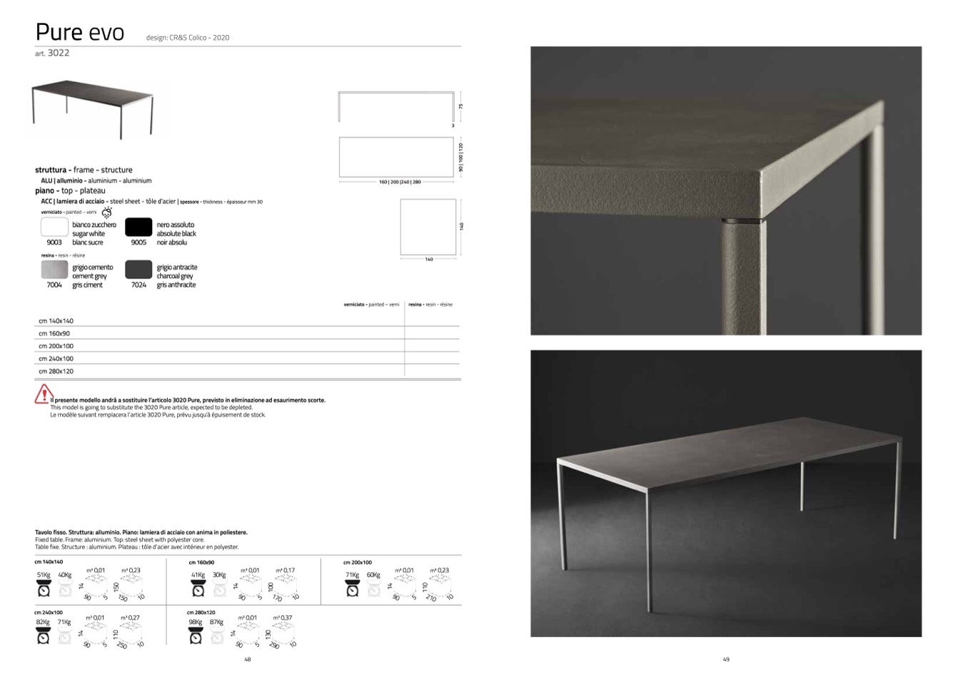 Tavolo fisso. Struttura: alluminio. Piano: lamiera di acciaio con anima in poliestere.