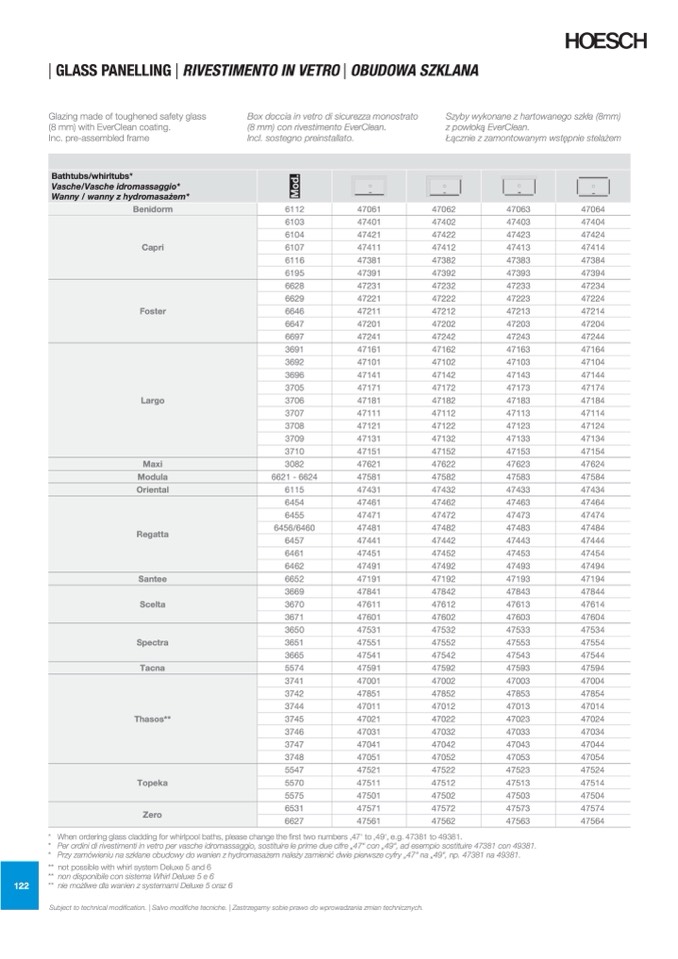 Per ordini di rivestimenti in vetro per vasche idromassaggio, sostituire le prime due cifre „47“ con „49“, ad esempio sostituire 47381 con 49381.