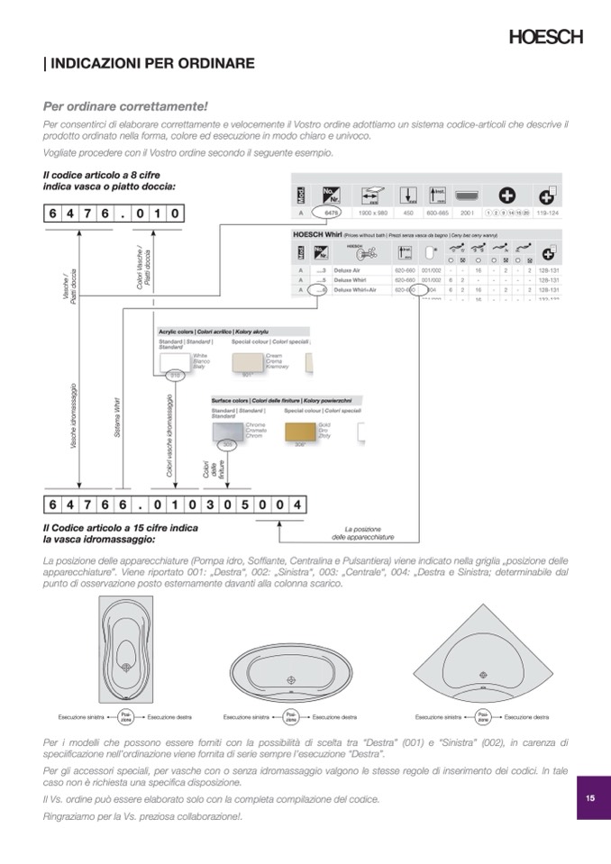 Per gli accessori speciali, per vasche con o senza idromassaggio valgono le stesse regole di inserimento dei codici. In tale