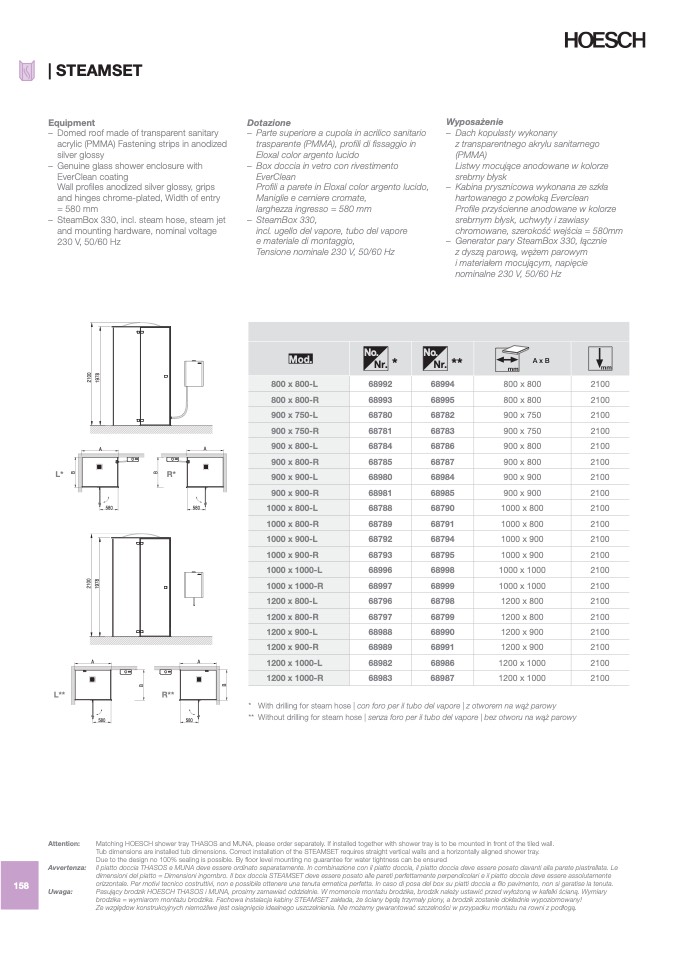 dimensioni del piatto = Dimensioni ingombro. Il box doccia STEAMSET deve essere posato alle pareti perfettamente perpendicolari e il piatto doccia deve essere assolutamente