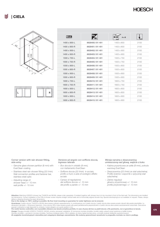 dimensioni del piatto = Dimensioni ingombro. Il box doccia CIELA deve essere posato alle pareti perfettamente perpendicolari e il piatto doccia deve essere assolutamente orizzontale. Esecuzione