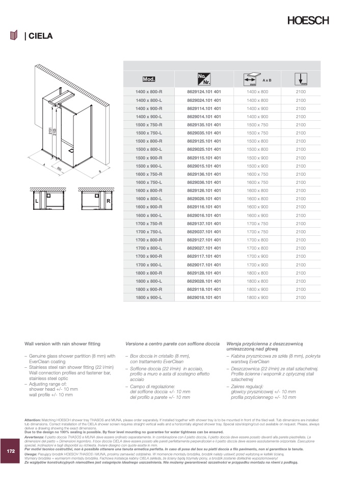 dimensioni del piatto = Dimensioni ingombro. Il box doccia CIELA deve essere posato alle pareti perfettamente perpendicolari e il piatto doccia deve essere assolutamente orizzontale. Esecuzione