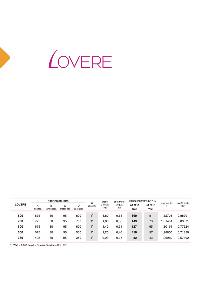 * 1 Watt = 0,863 Kcal/h - Potenza Termica = Km · ∆T