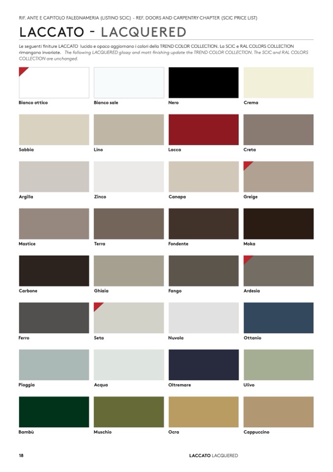 Le seguenti finiture LACCATO lucido e opaco aggiornano i colori della TREND COLOR COLLECTION. La SCIC e RAL COLORS COLLECTION