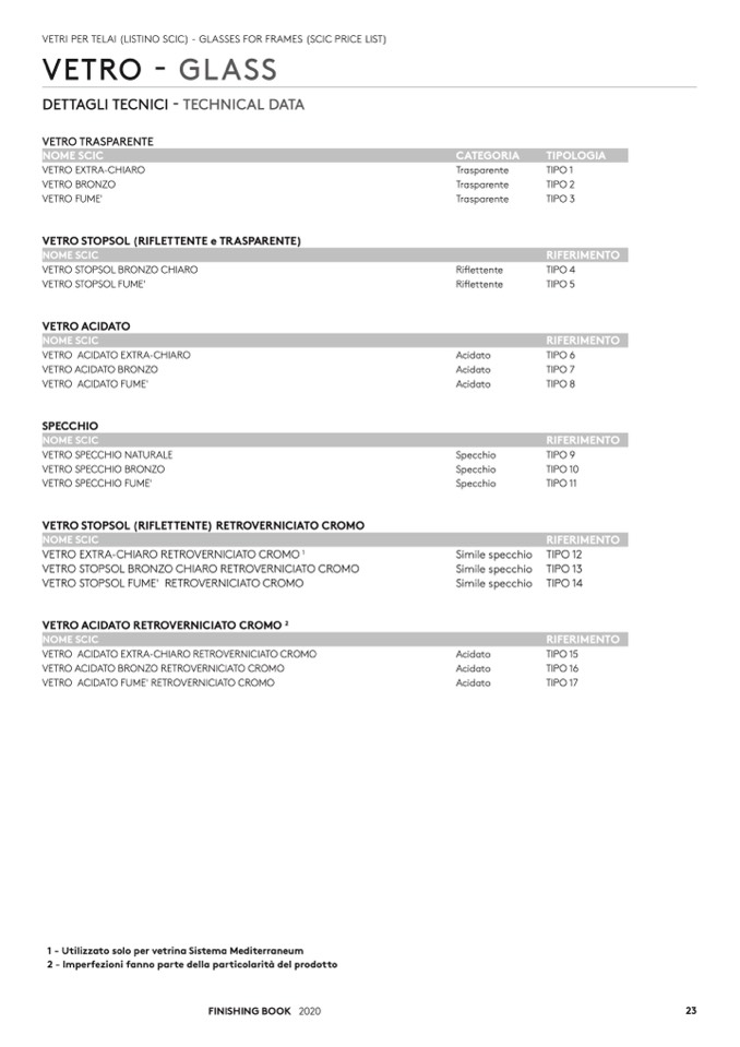 VETRI PER TELAI (LISTINO SCIC) - GLASSES FOR FRAMES (SCIC PRICE LIST)