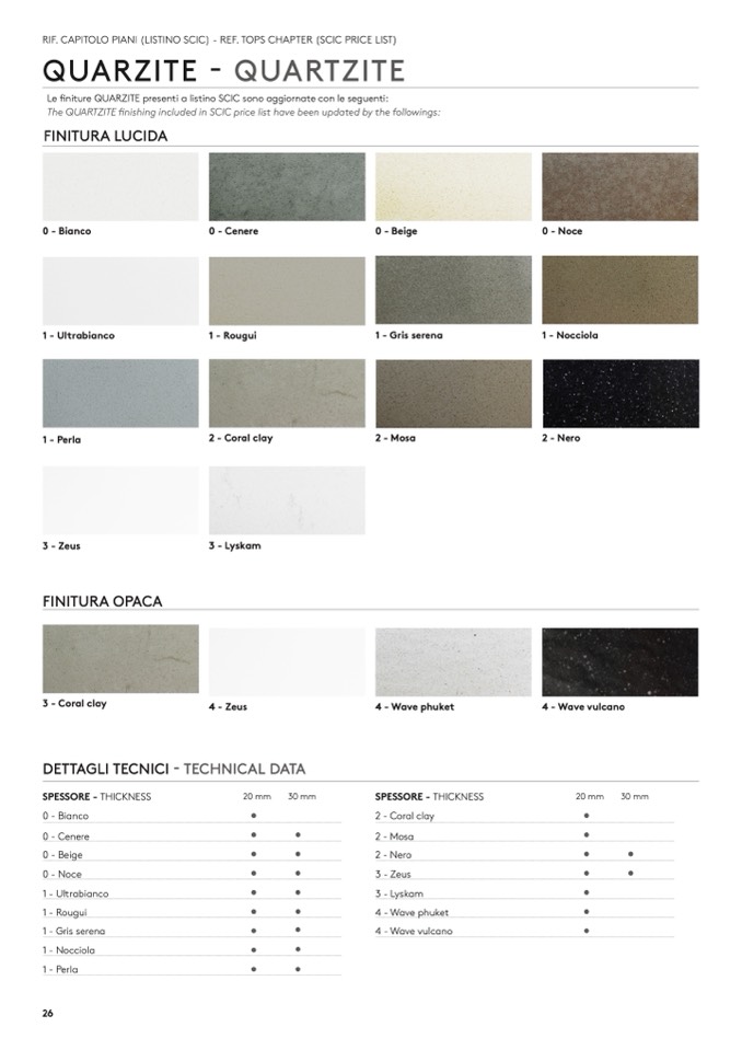 The QUARTZITE finishing included in SCIC price list have been updated by the followings: