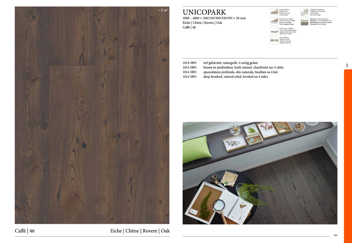 tief gebürstet, naturgeölt, 4-seitig gefast