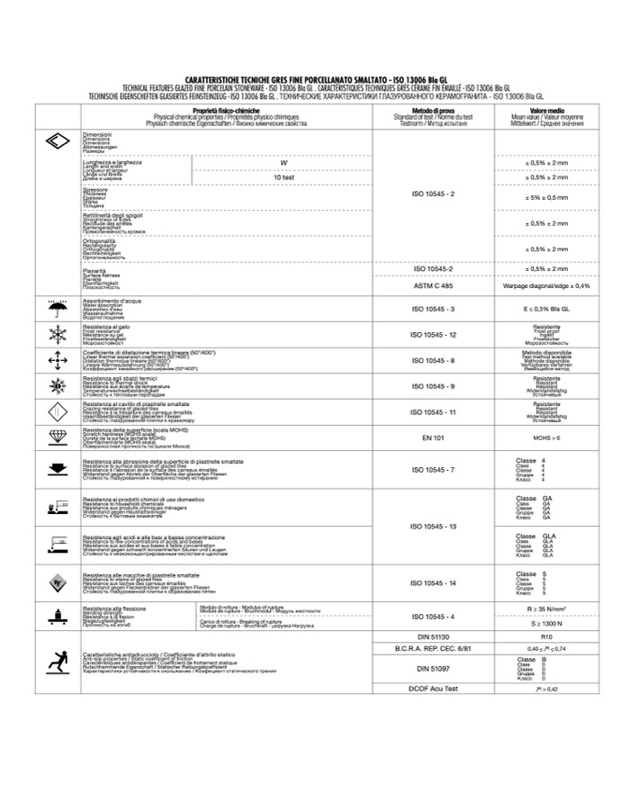 TECHNICAL FEATURES GLAZED FINE PORCELAIN STONEWARE - ISO 13006 BIa GL . CARACTÉRISTIQUES TECHNIQUES GR