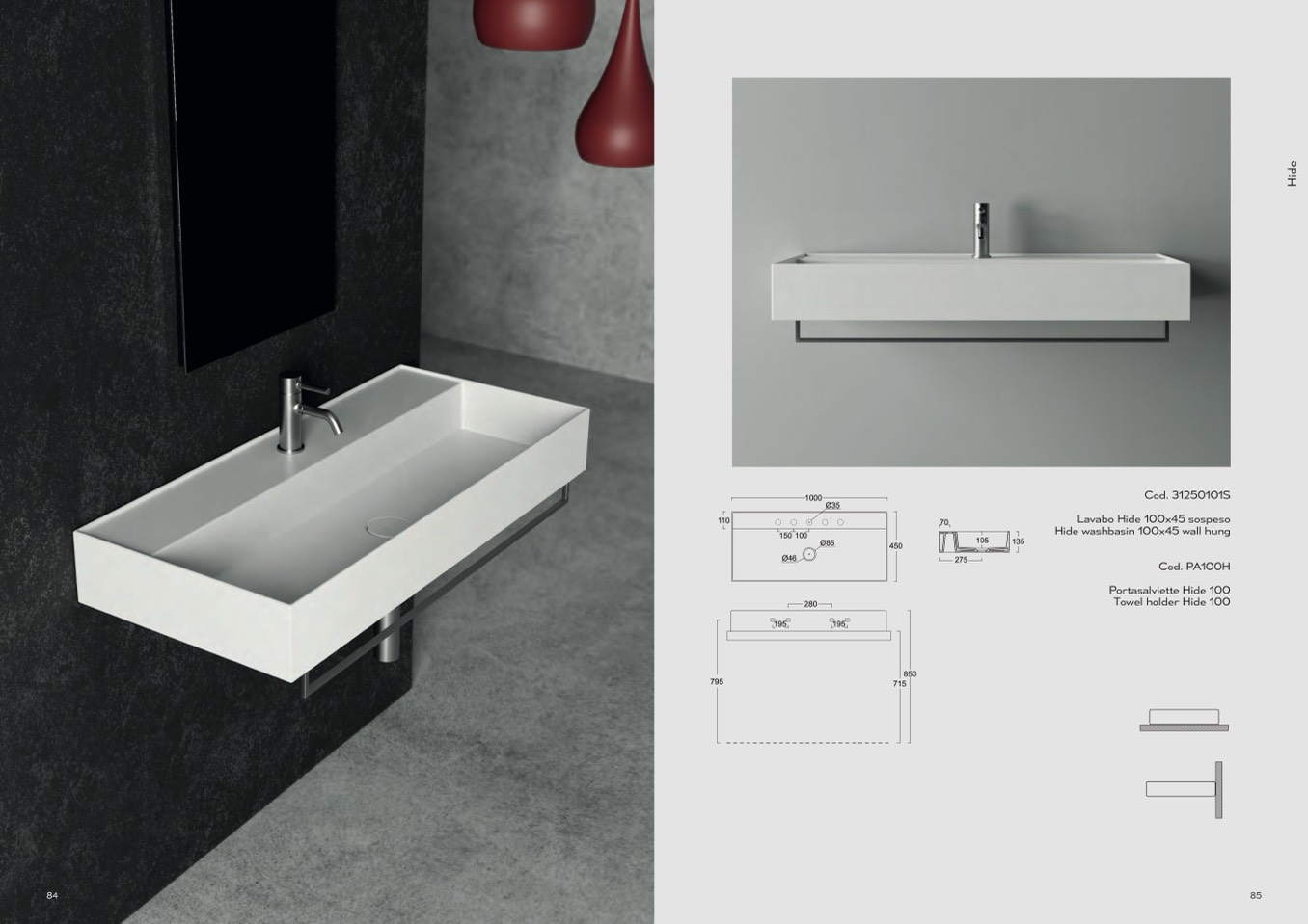 Hide washbasin 100x45 wall hung