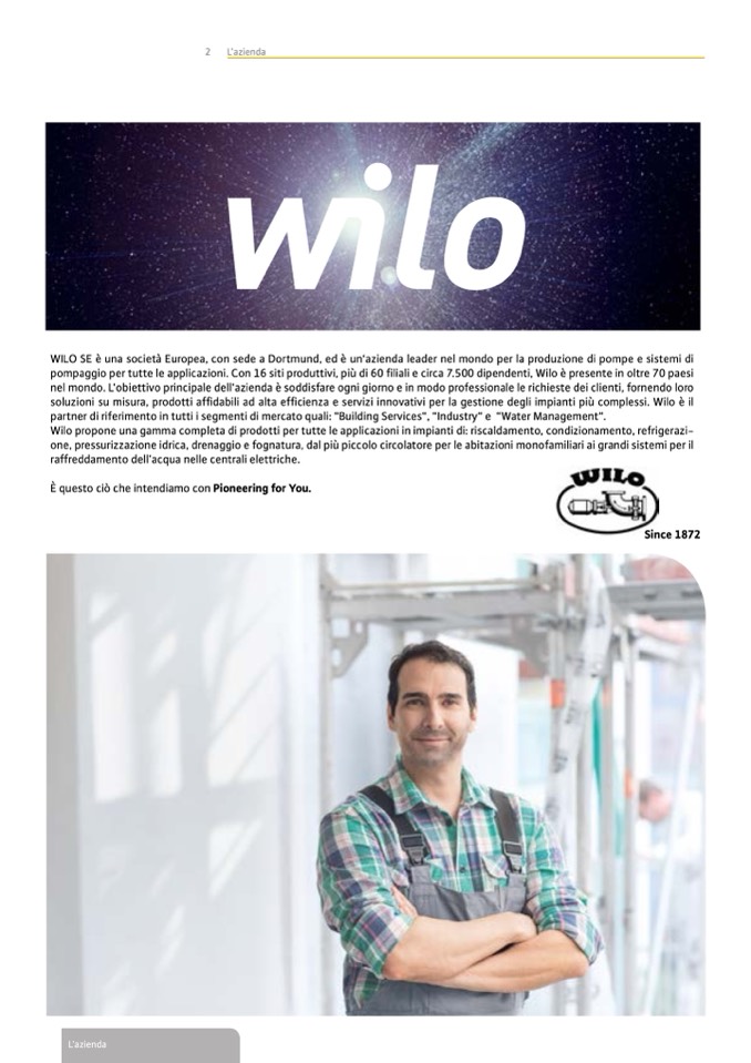 Wilo propone una gamma completa di prodotti per tutte le applicazioni in impianti di: riscaldamento, condizionamento, refrigerazi-