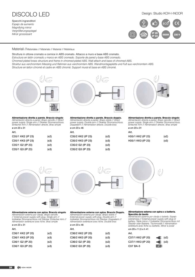 Struttura in ottone cromato e cornice in ABS cromato. Attacco a muro e base ABS cromato.