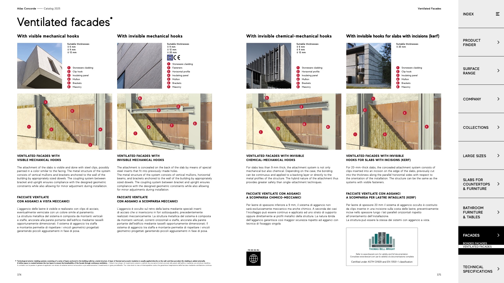 Technological exterior cladding systems consisting of a series of layers anchored to the building walls by a metal structure. A layer of thermal and acoustic insulation is usually applied directly on the wall, and then porcelain tile cladding is added externally.