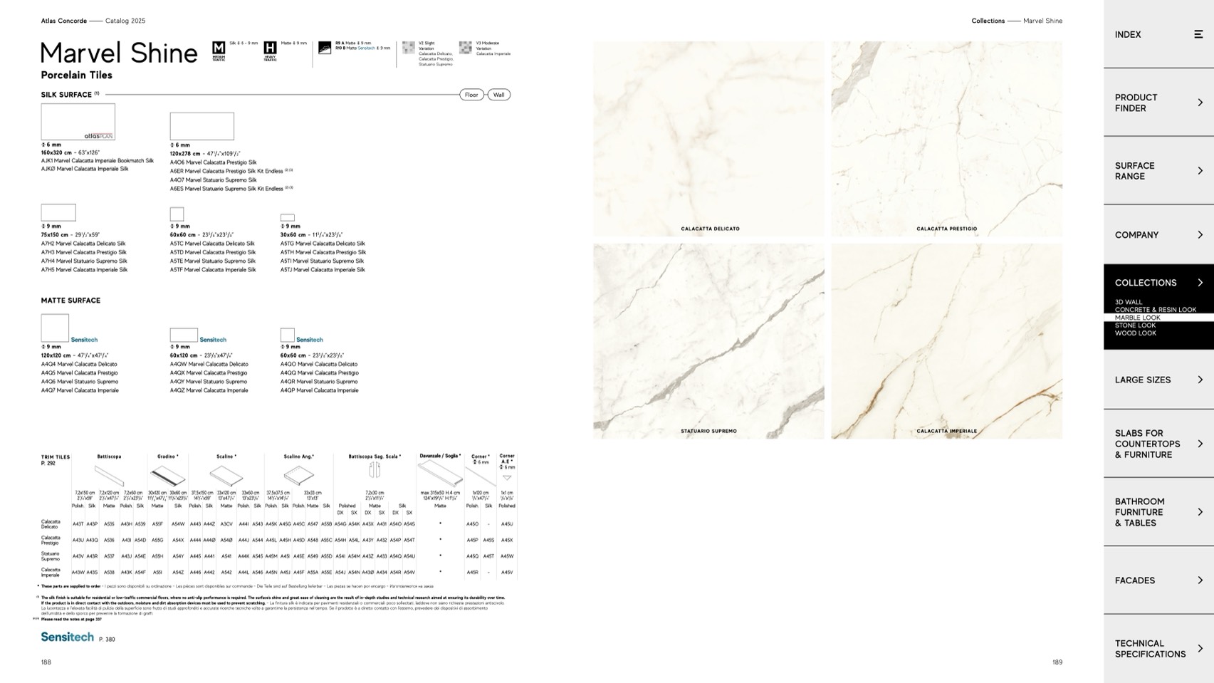The silk finish is suitable for residential or low-traffic commercial floors, where no anti-slip performance is required. The surface's shine and great ease of cleaning are the result of in-depth studies and technical research aimed at ensuring its durability over time.