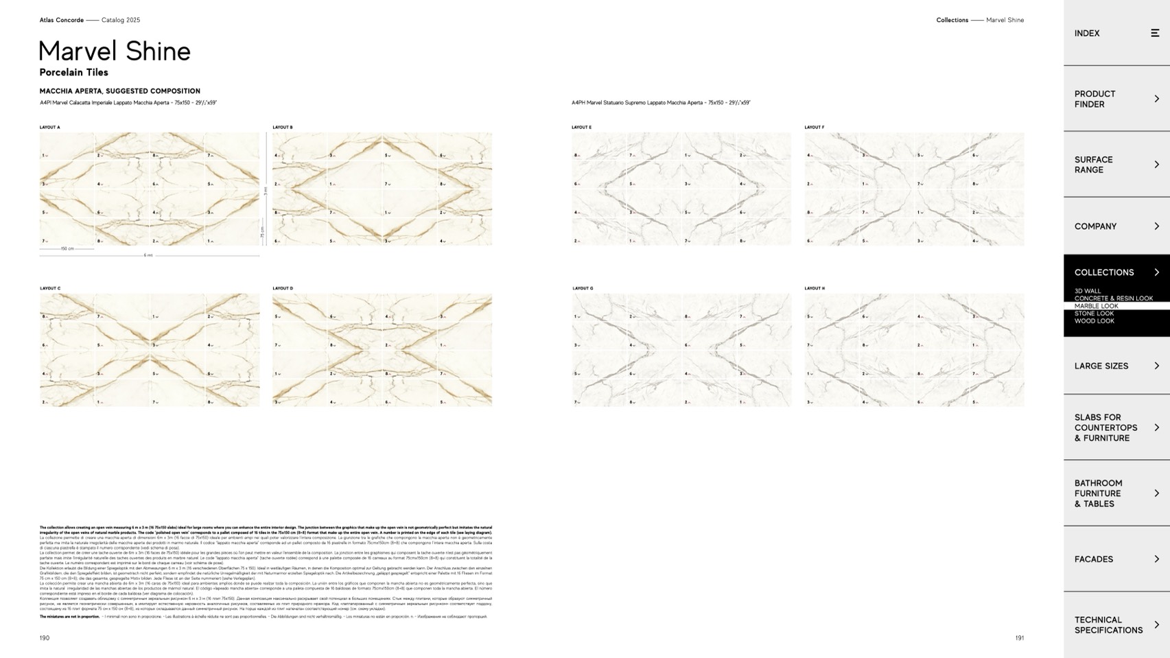 La collezione permette di creare una macchia aperta di dimensioni 6m x 3m (16 facce di 75x150) ideale per ambienti ampi nei quali poter valorizzare l’intera composizione. La giunzione tra le grafiche che compongono la macchia aperta non è geometricamente