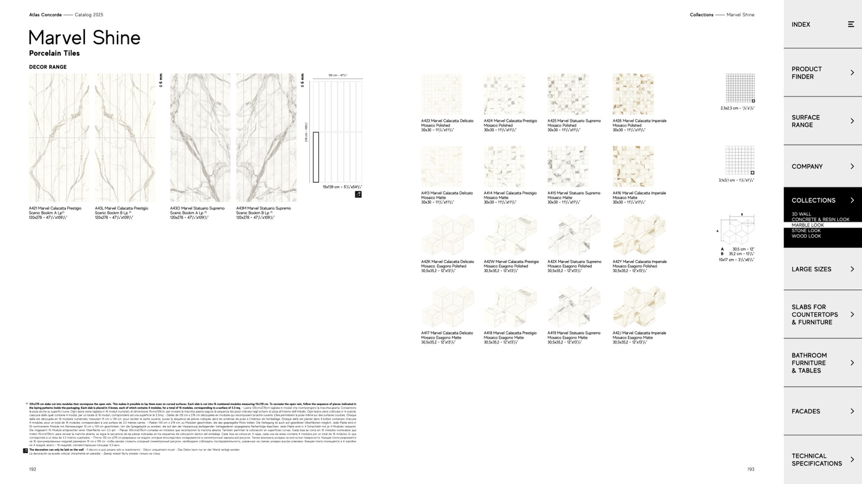 120x278 cm slabs cut into modules that recompose the open vein. This makes it possible to lay them even on curved surfaces. Each slab is cut into 16 numbered modules measuring 15x139 cm. To recreate the open vein, follow the sequence of pieces indicated in