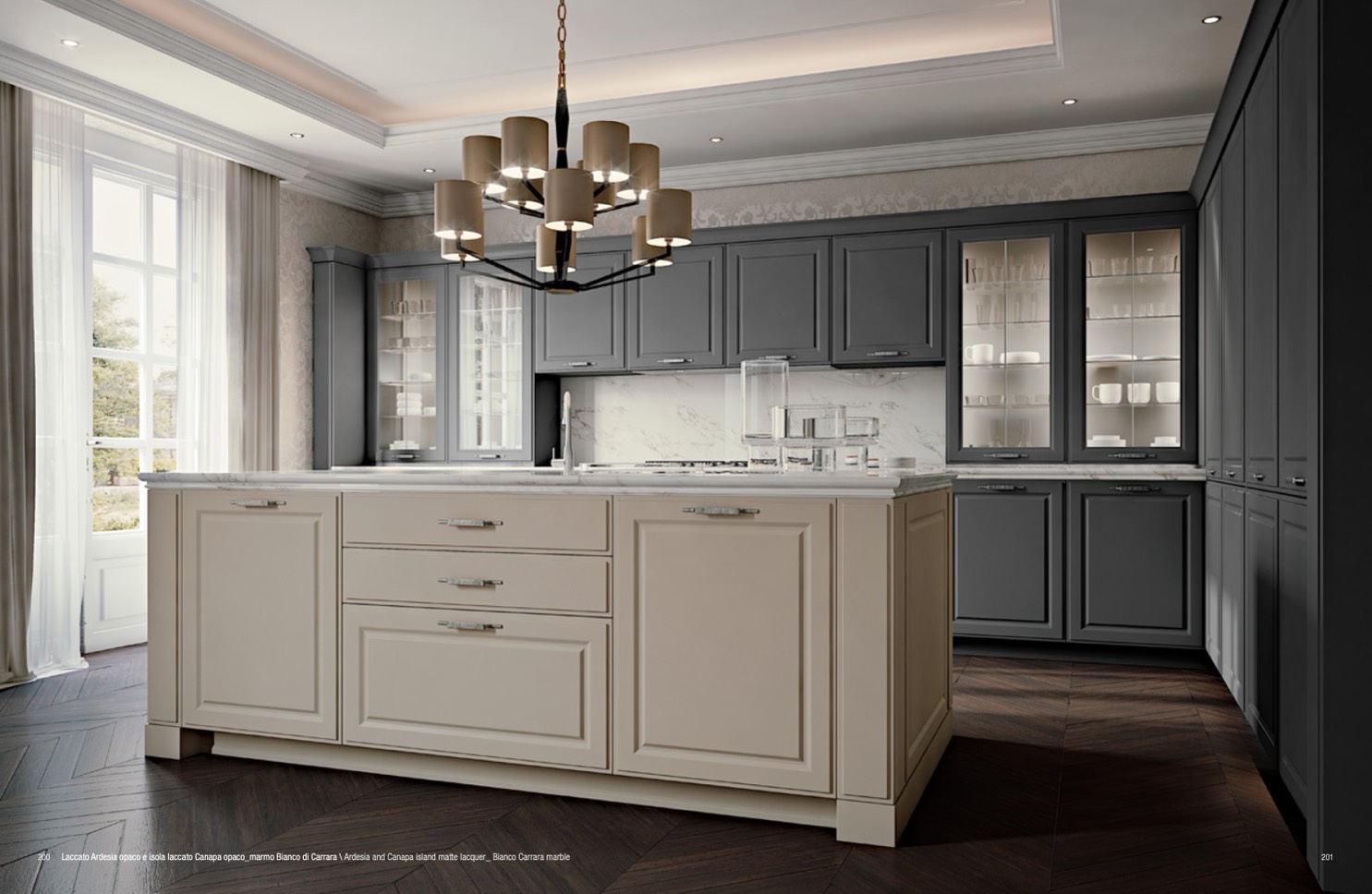 200 Laccato Ardesia opaco e isola laccato Canapa opaco_marmo Bianco di Carrara \ Ardesia and Canapa island matte lacquer_ Bianco Carrara marble