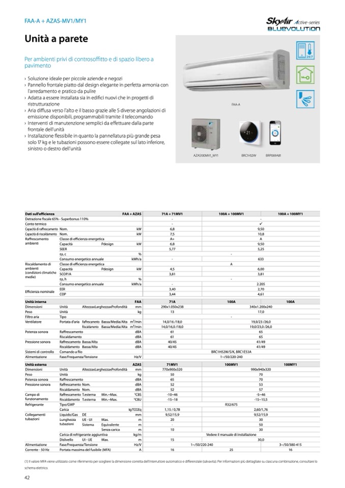 (1) Il valore MFA viene utilizzato come riferimento per scegliere la dimensione corretta dell'interruttore automatico e differenziale (salvavita). Per informazioni più dettagliate su ciascuna combinazione, consultare lo