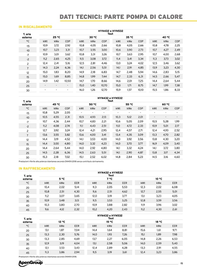 Prestazioni riferite alla potenza istantanea secondo EN14511:2018 senza contributo sbrinamento.