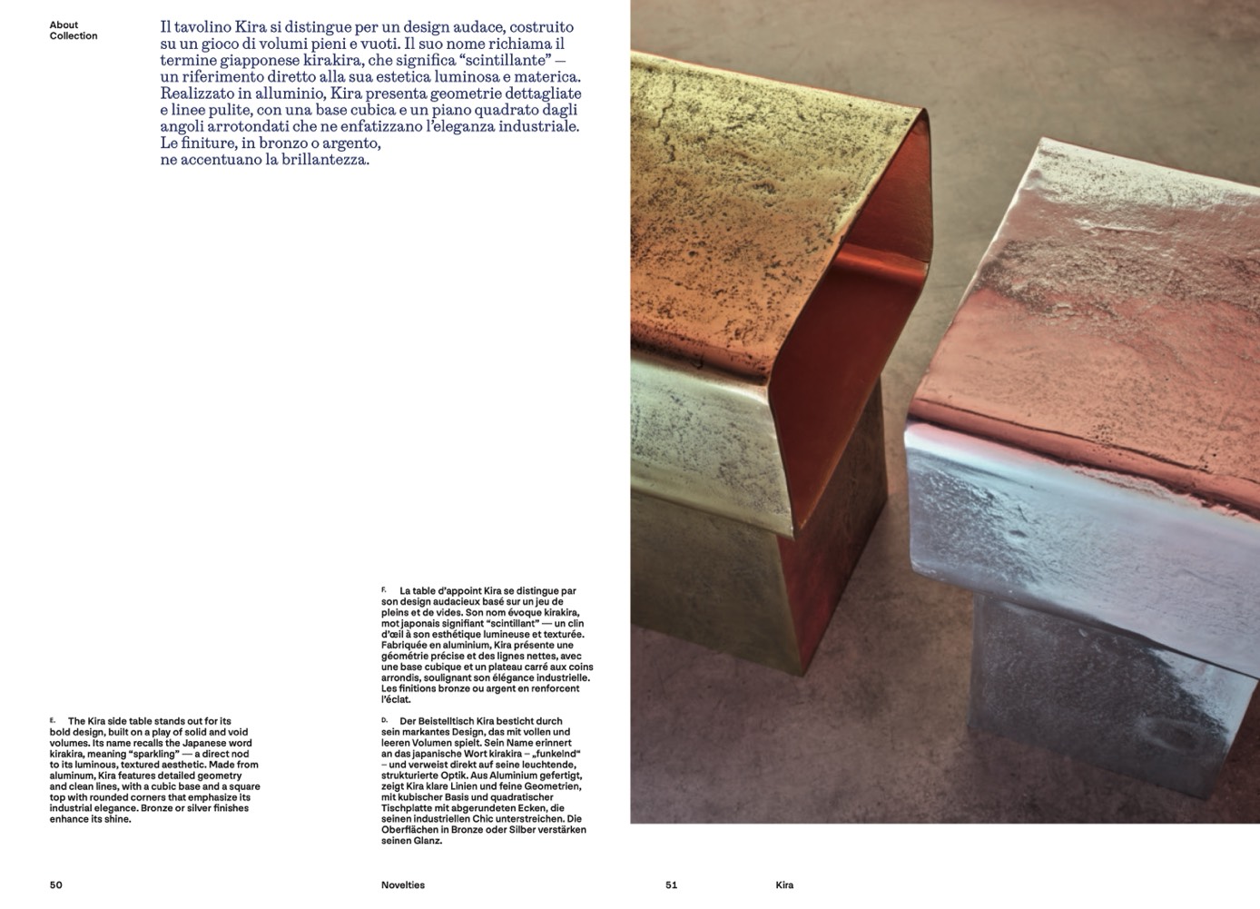 Realizzato in alluminio, Kira presenta geometrie dettagliate