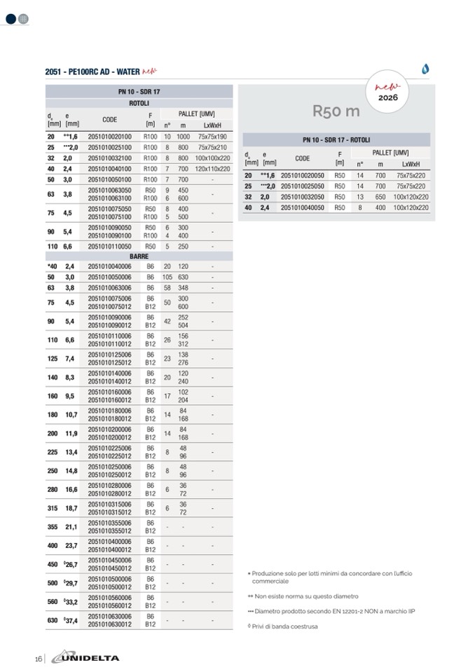 ••• Diametro prodotto secondo EN 12201-2 NON a marchio IIP