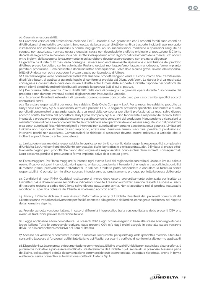 10.1 Garanzia verso clienti professionali/aziende (B2B). Unidelta S.p.A. garantisce che i prodotti forniti sono esenti da