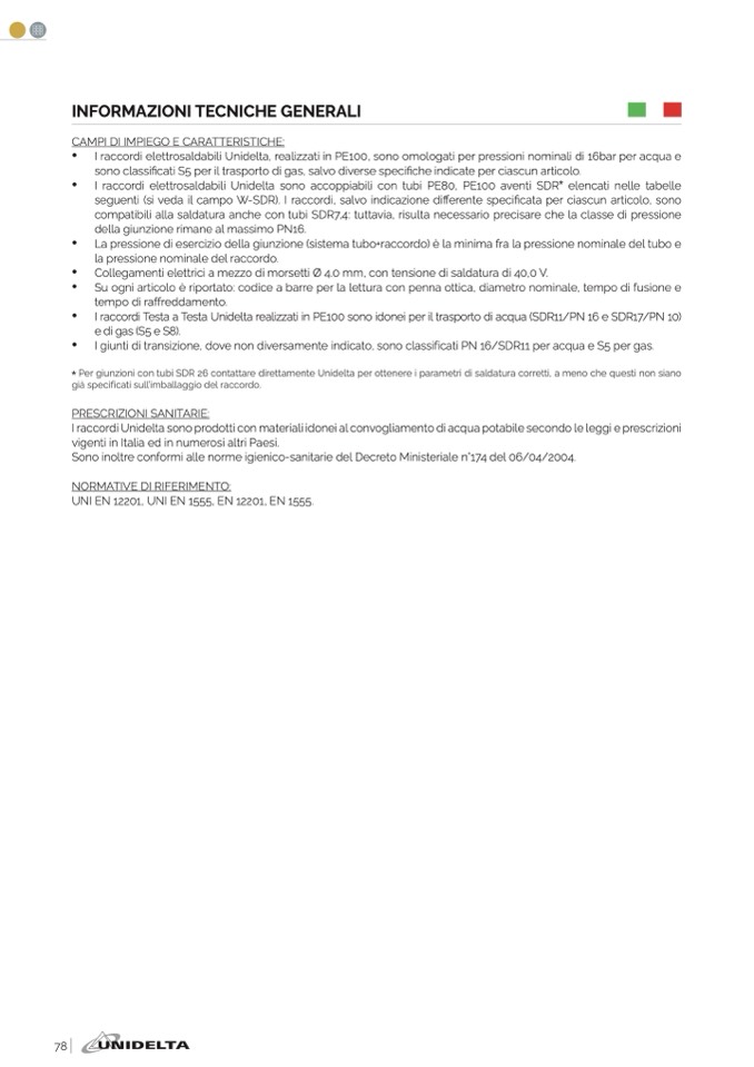 I raccordi elettrosaldabili Unidelta sono accoppiabili con tubi PE80, PE100 aventi SDR* elencati nelle tabelle