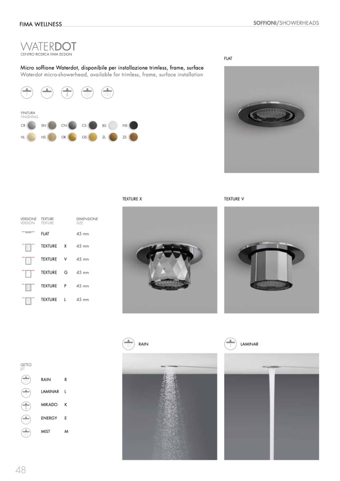 Micro soffione Waterdot, disponibile per installazione trimless, frame, surface