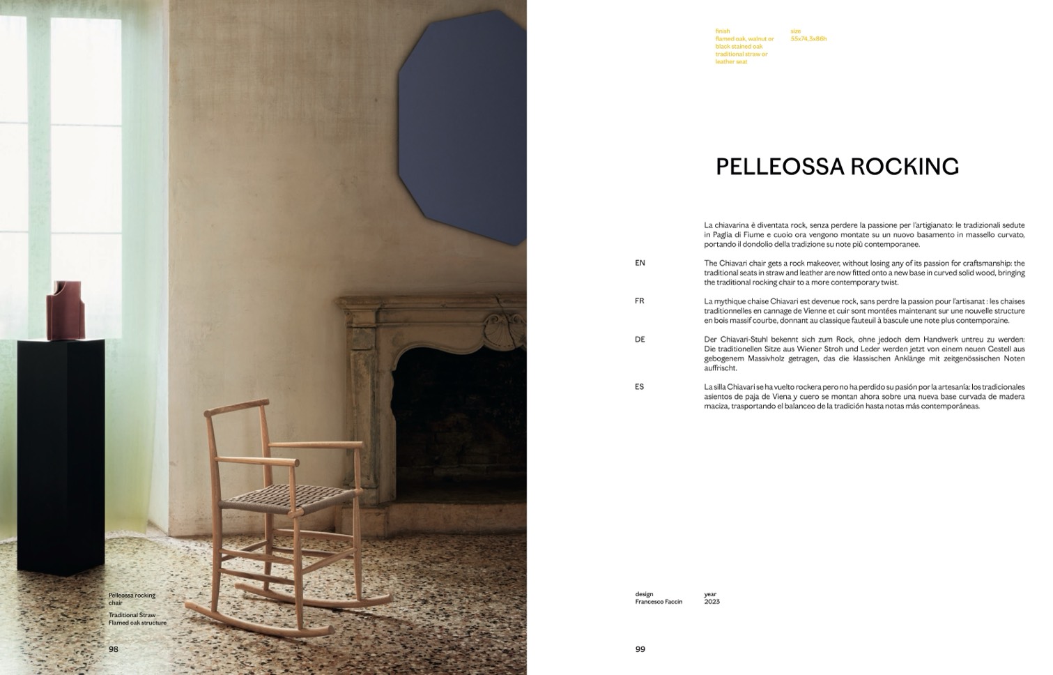 traditional seats in straw and leather are now fitted onto a new base in curved solid wood, bringing