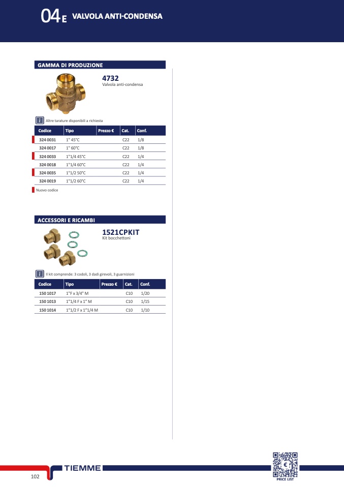 Il kit comprende: 3 codoli, 3 dadi girevoli, 3 guarnizioni