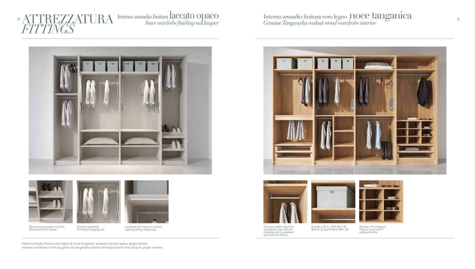Internal wardrobe finishing genuine tanganyka walnut and equipment mat lacquer grigio cenere.