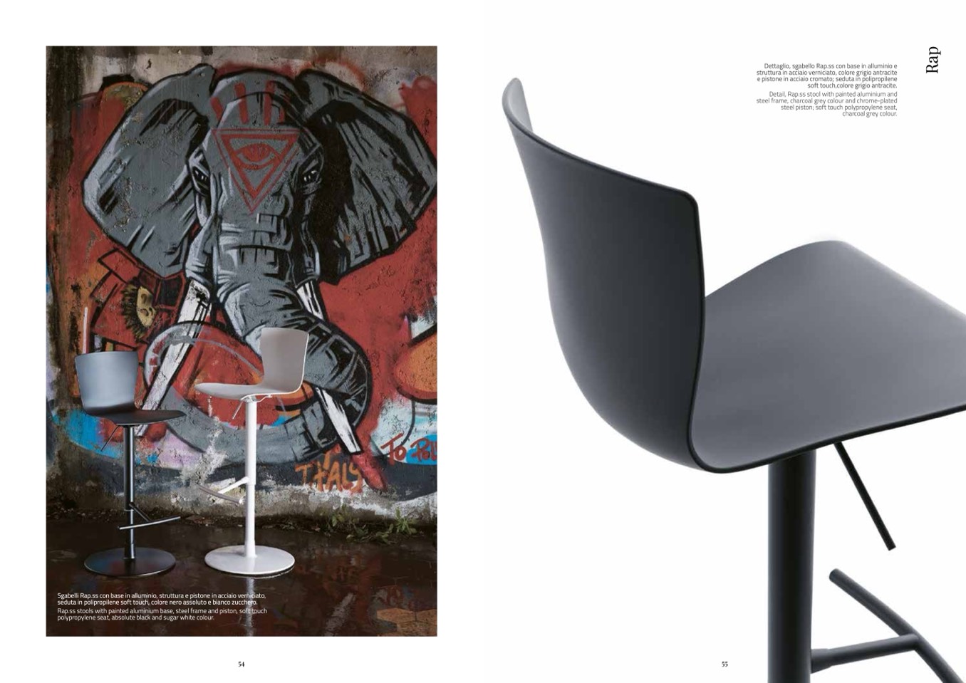 Rap.ss stools with painted aluminium base, steel frame and piston, soft touch