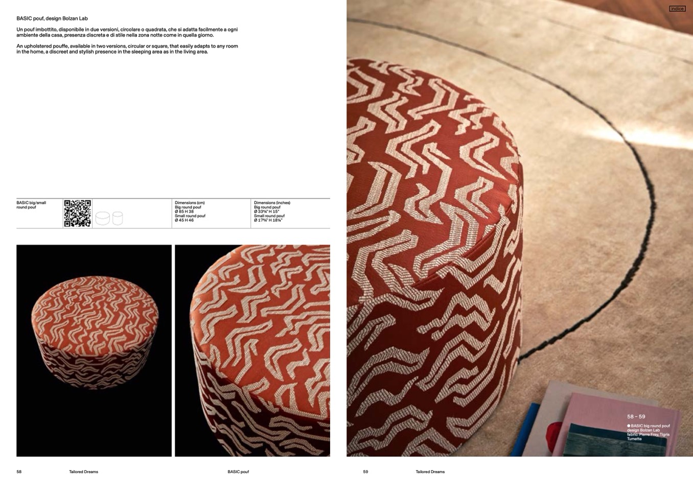 An upholstered pouffe, available in two versions, circular or square, that easily adapts to any room